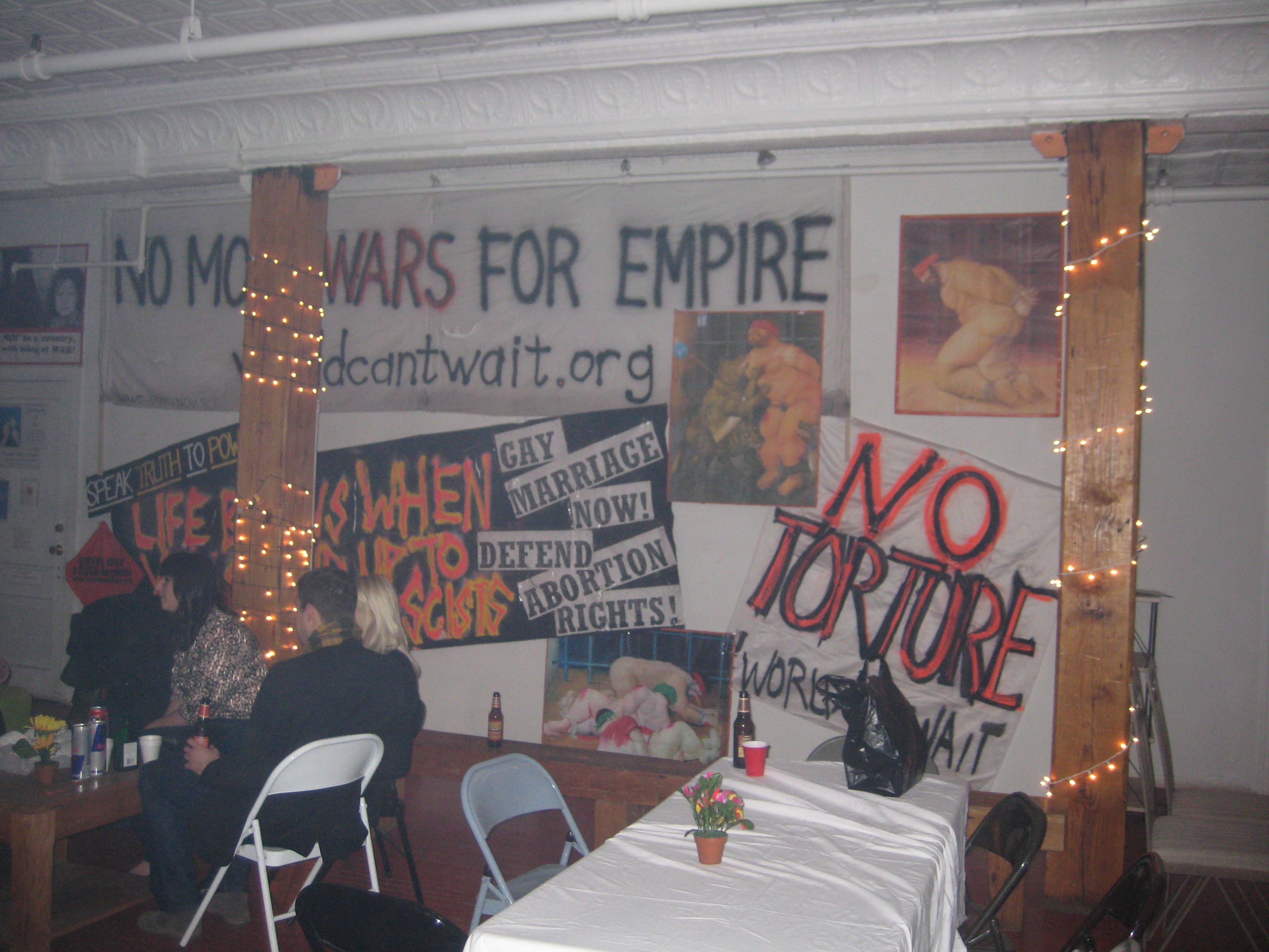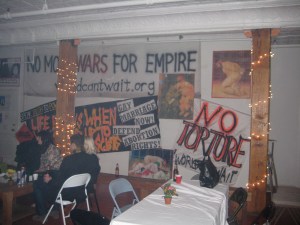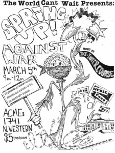 What a great event at Acme Arts Center! It was a fund raiser to help send youth to protest the war in Iraq in D.C. I contributed a series of hand drawn protest signs and did an installation with actual protest banners used throughout the year by activists. We set up an area where visitors could build and create there own protest signs (sticks and all) and add them to the installation. I also had a ball hand-drawing the flyer like we used to do back in the day. The music rocked, the food was great and the company was warm, smart and happy to dance. My kind of people!